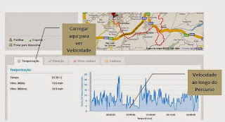 E agora o melhor da aplicação. Podemos ver o filme do passeio in loco através da opção "Leitor" onde vimos a deslocação da bicicleta pelo trilho marcado a vermelho e podemos consultar em pormenor o desempenho km a km do ciclista.